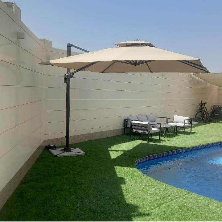 Heavy-duty 3m × 3m cantilever umbrella with full aluminium frame, waterproof canopy, and extra-strong 80kg marble stone base. Designed for UAE weather – perfect for villas, pools, gardens, cafés, restaurants, and outdoor seating areas.