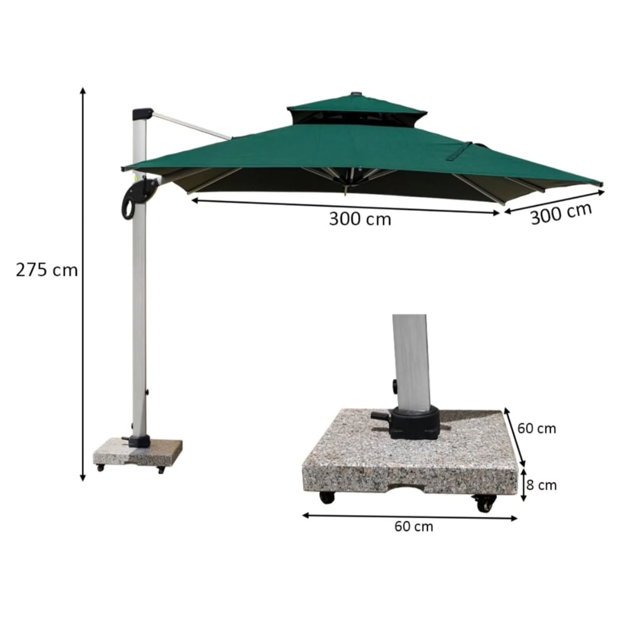 Heavy-duty 3m × 3m cantilever umbrella with full aluminium frame, waterproof fabric canopy and mobile 80kg marble base with wheels. Designed for UAE weather – perfect for villas, cafés, and outdoor seating areas.