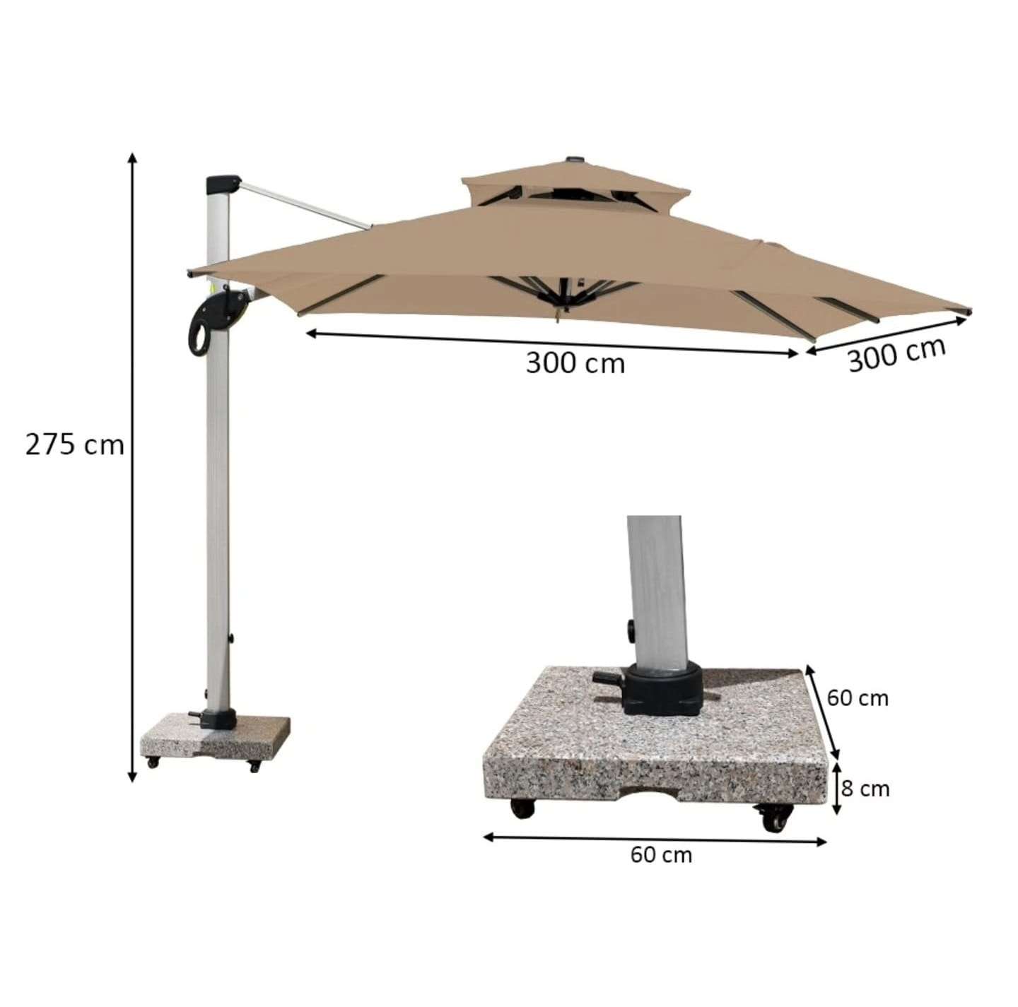 3m × 3m Cantilever Umbrella – Full Aluminium Frame, Waterproof Fabric, 80KG Marble Base with Wheels – 2100 AED