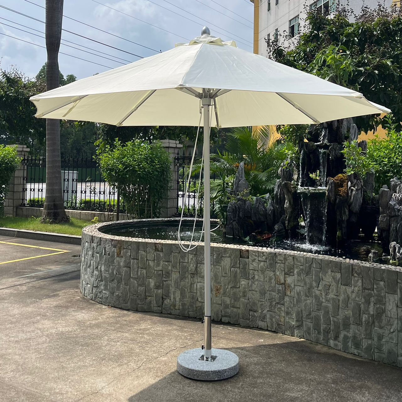 For unmatched stability, the umbrella includes a 40kg solid marble base, ensuring it remains steady even in breezy conditions. The sleek white design blends beautifully with any outdoor décor, making it ideal for villas, cafés, resorts, and home gardens.